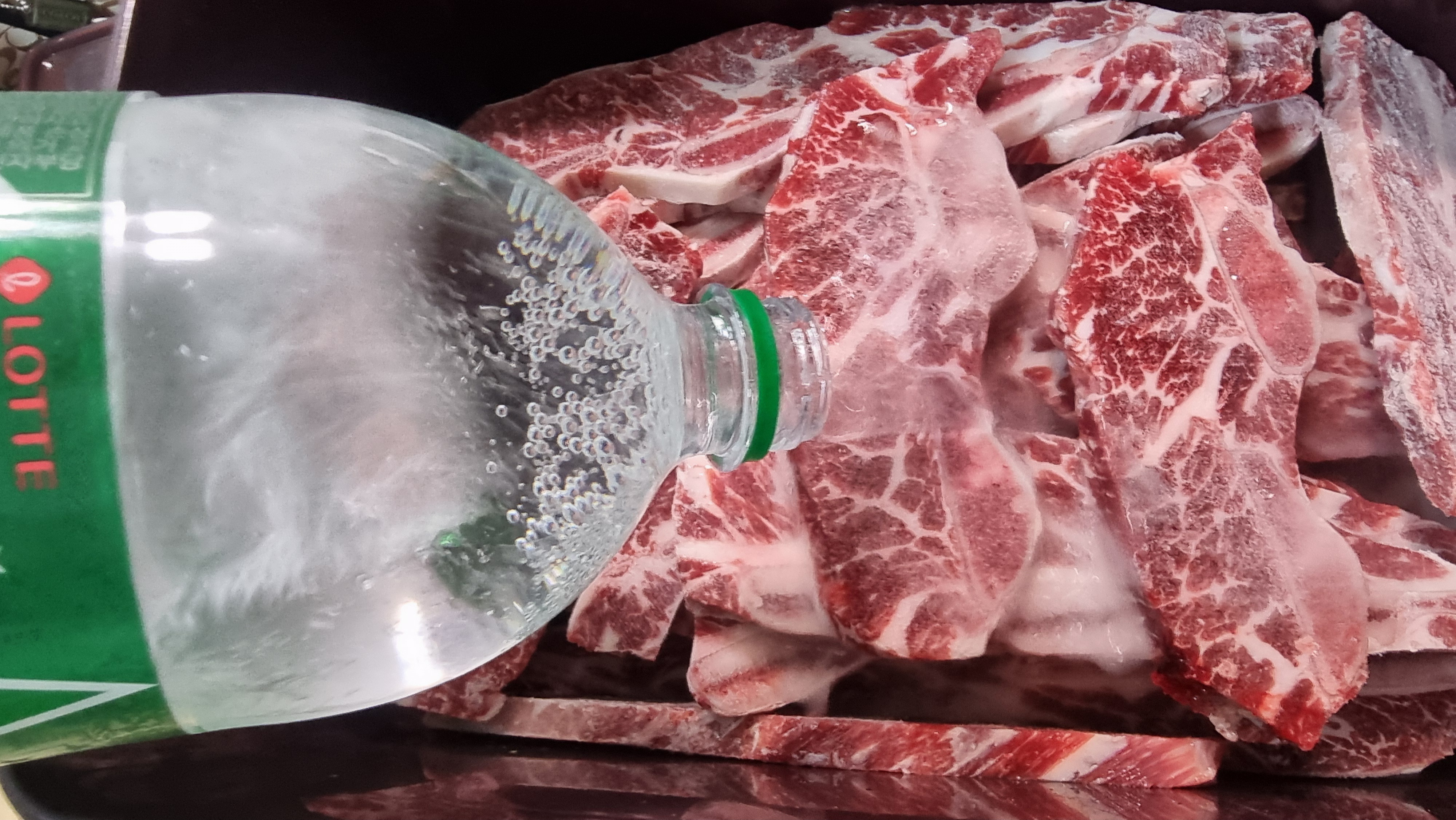 에서 찾아와 김치통에 갈비를 차곡 차곡 넣고 사이다2병과 물을 붓고 30분