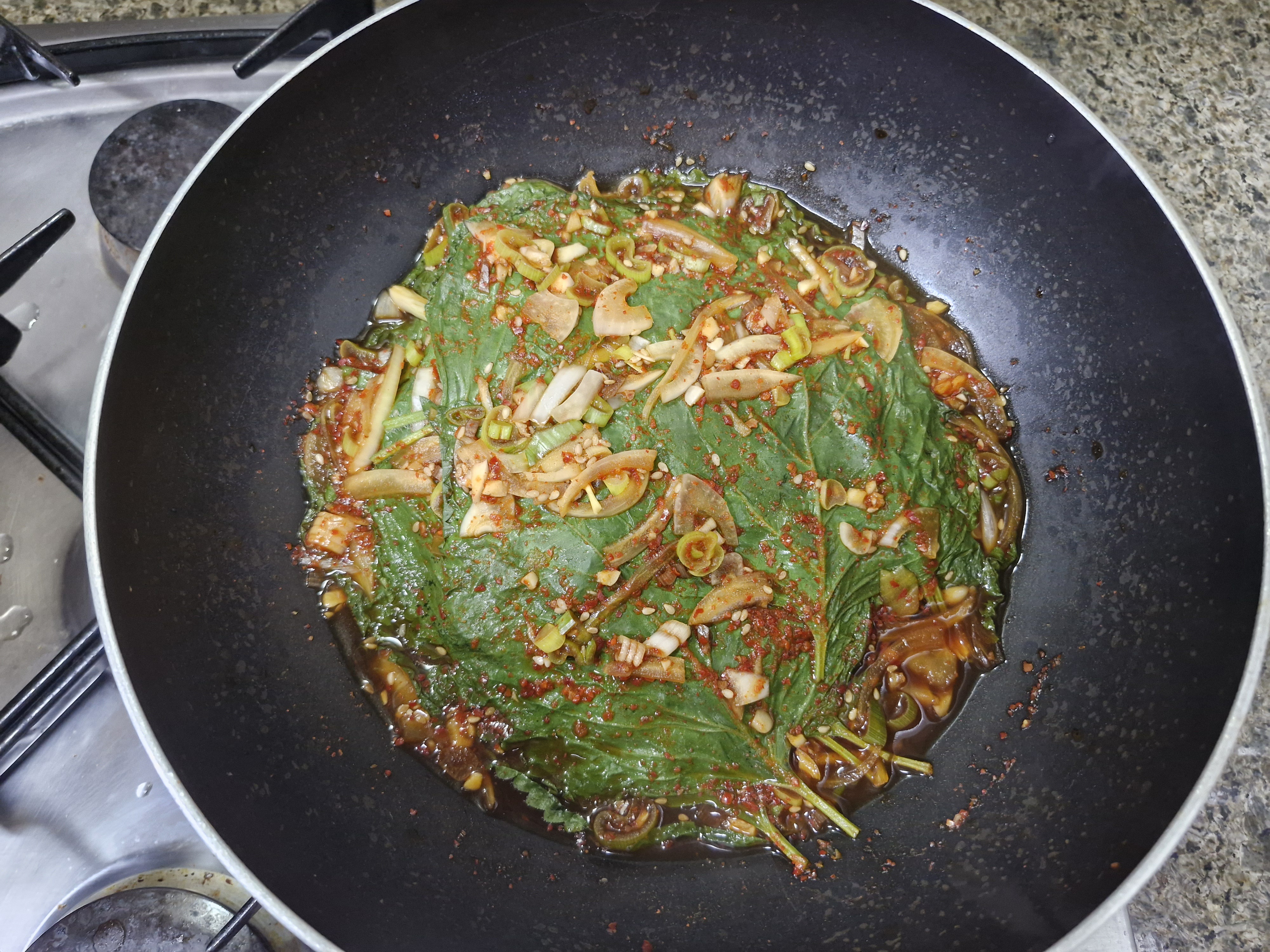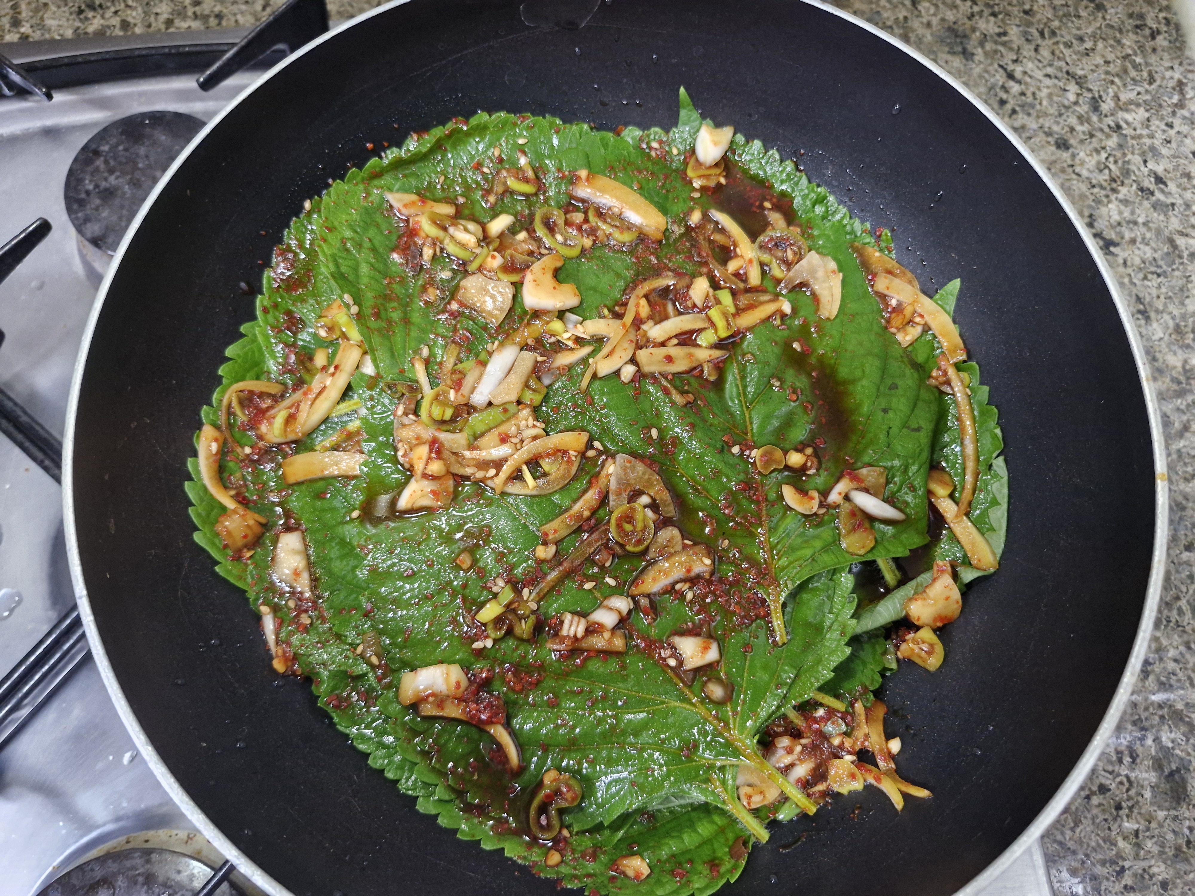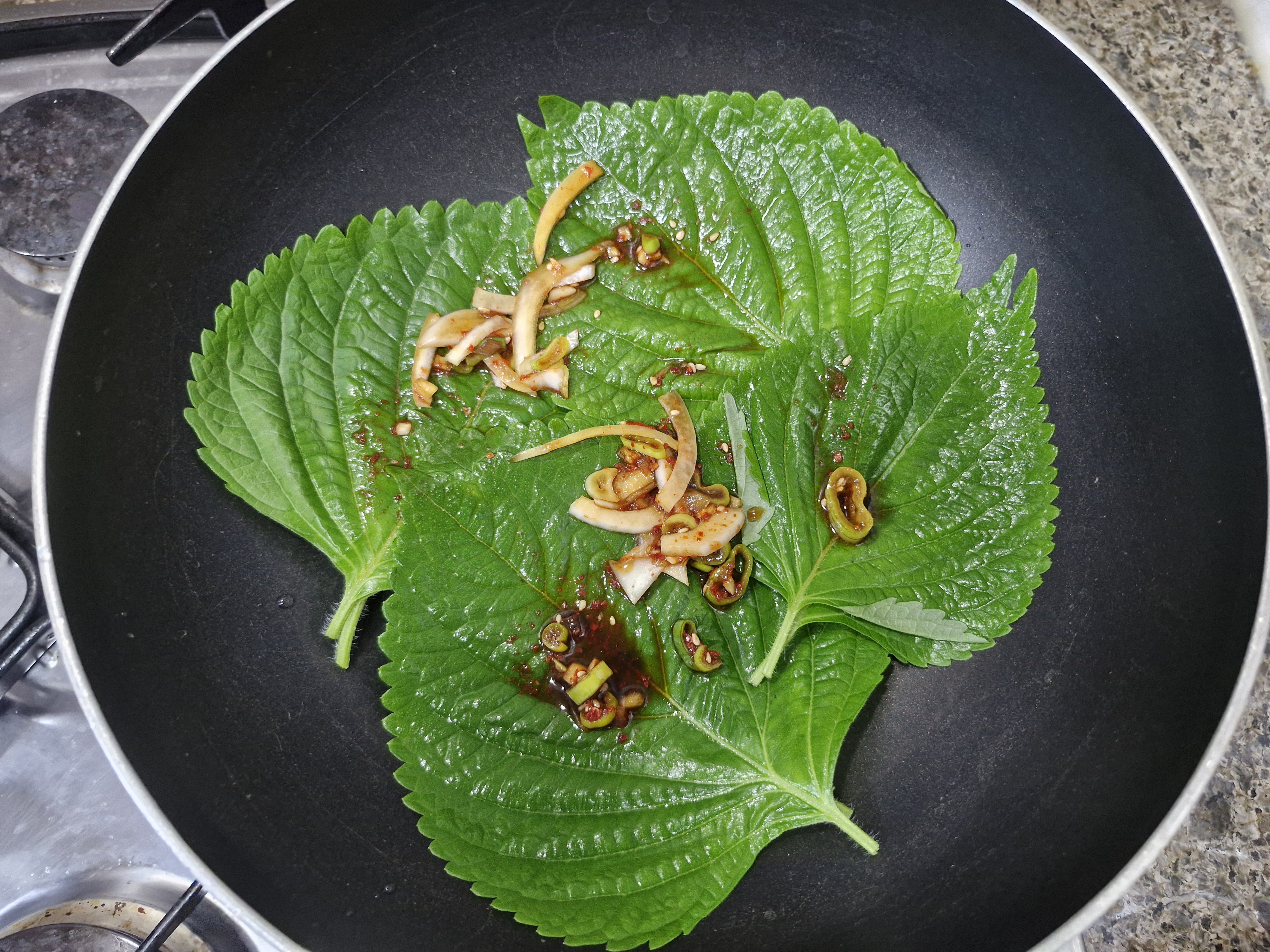 물기를 빼주고 팬에 깻잎두장을 올리고