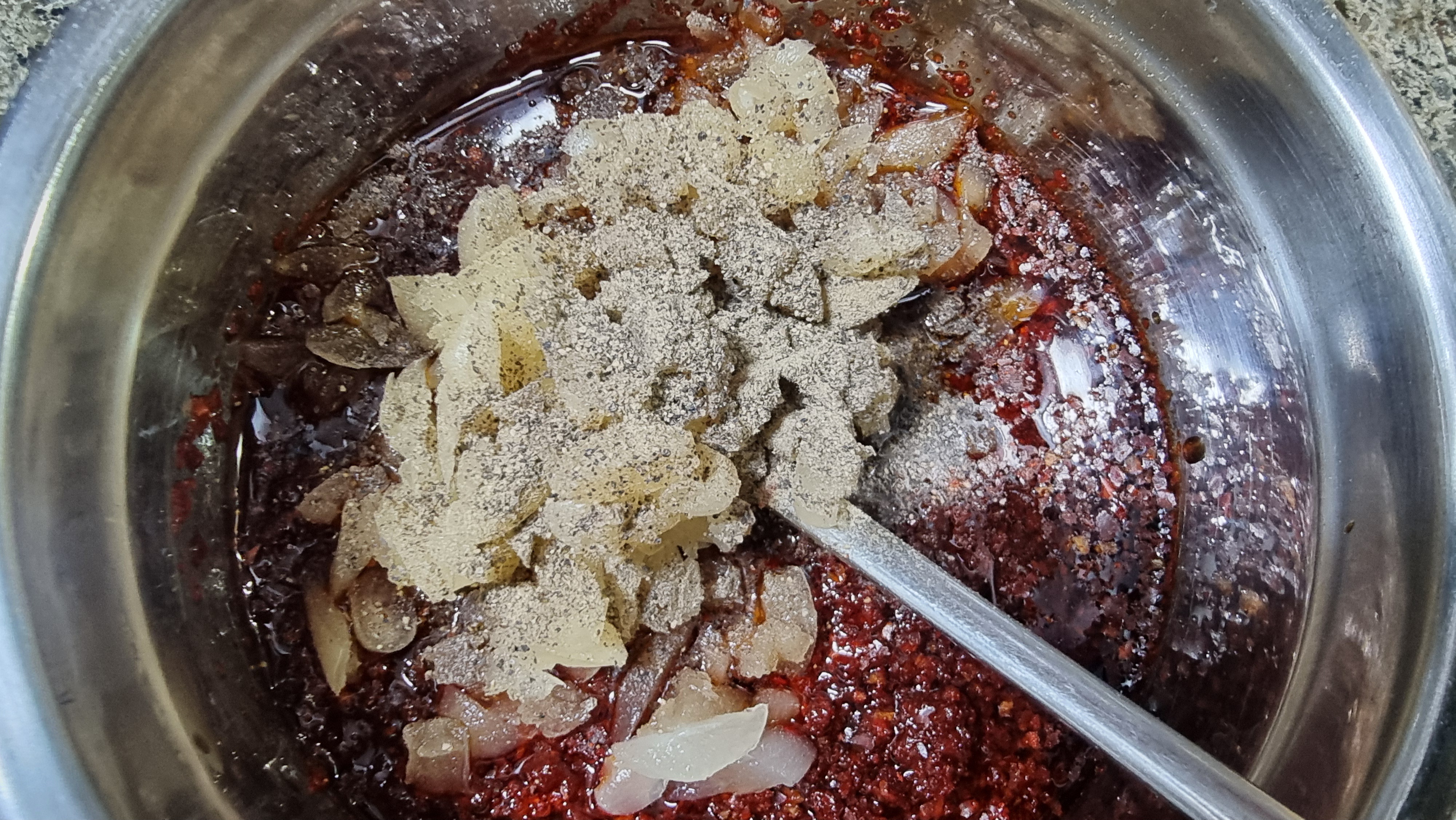 (고추기름이 들어가서 물로 볶는다.